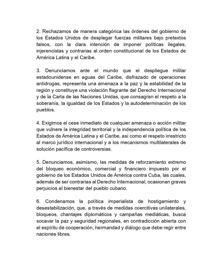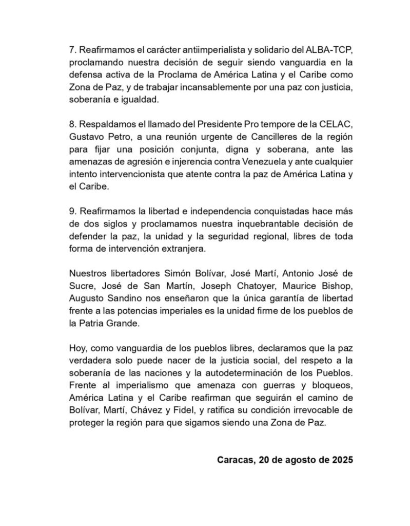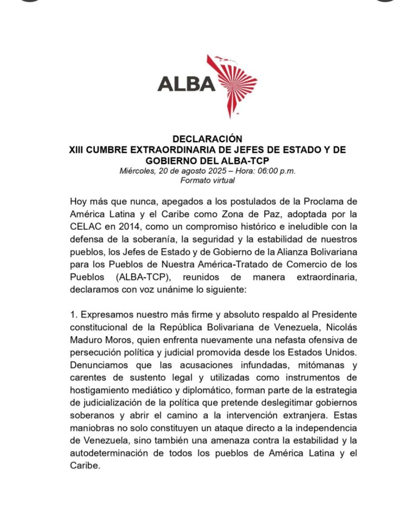 “El despliegue militar estadounidense en aguas del Caribe, disfrazado de operaciones antidrogas, representa una amenaza a la paz y a la estabilidad de la región”, dijo la Alianza Bolivariana para los Pueblos de Nuestra América, creada en 2004 por los entonces mandatarios de Cuba, Fidel Castro, y de Venezuela, Hugo Chávez.