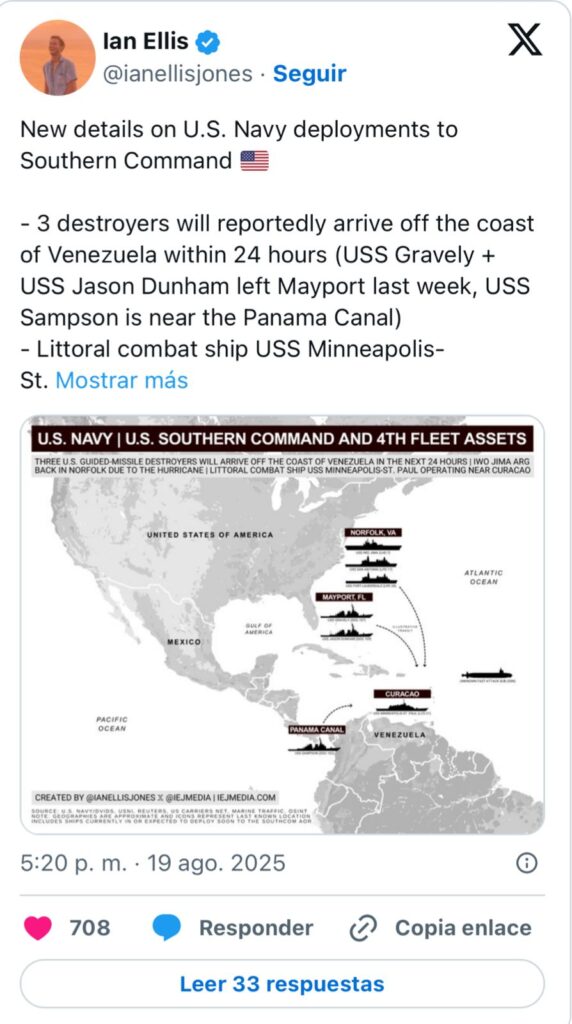 El despliegue ocurre después de que el gobierno de Trump aumentara a 50 millones la recompensa por “información que conduzca al arresto” del dictador venezolano, Nicolás Maduro, acusado por la justicia estadounidense de supuestos vínculos con el narcotráfico.
