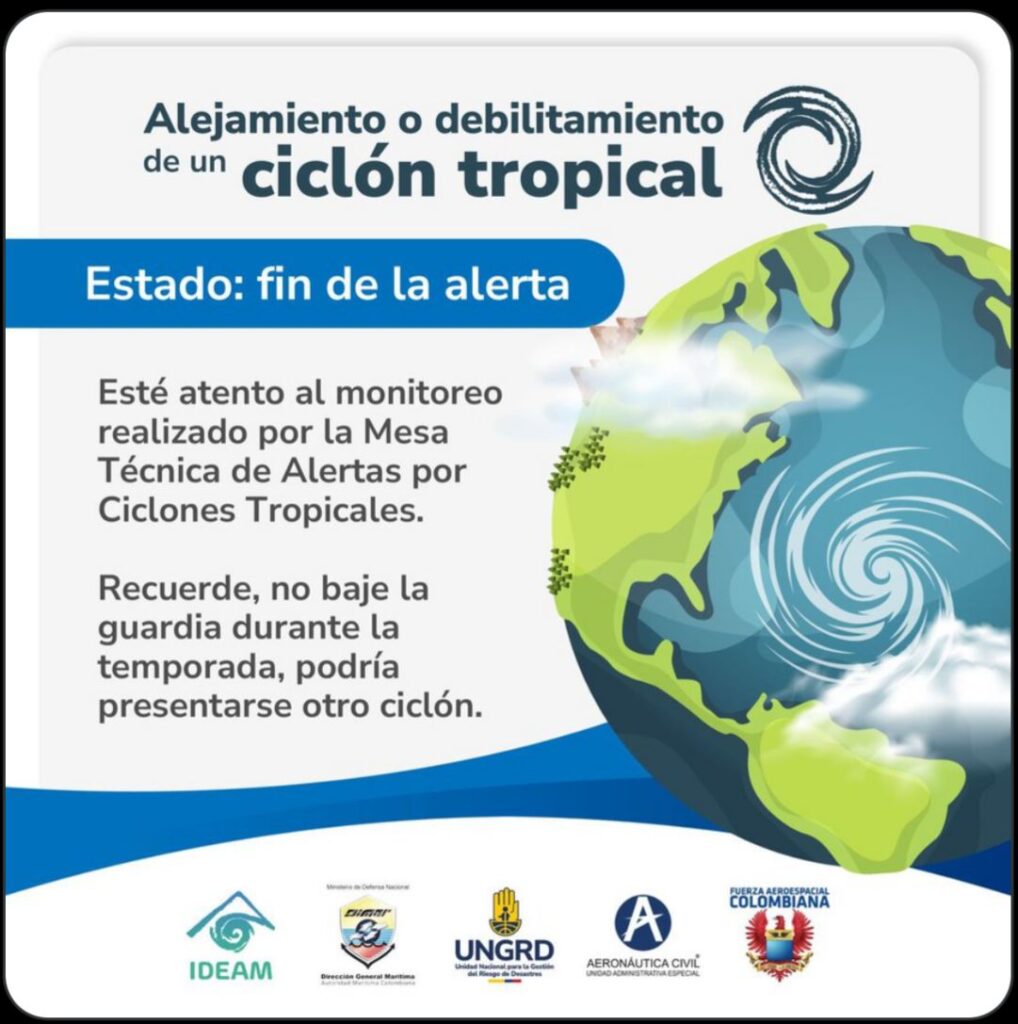 Al final, la onda tropical dejó de tener probabilidades de convertirse en ciclón tropical. En ese orden de ideas, se levantó la alerta para todos los departamentos, aunque la UNGRD insistió en estar pendiente de la información oficial en caso de que se emitan nuevas alertas.