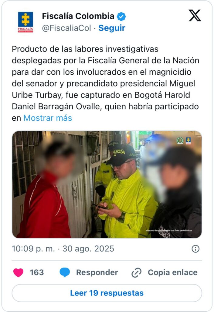 En horas de la noche del sábado 30 de agosto, Noticias RCN pudo confirmar que fue capturado otro presunto implicado en el magnicidio del precandidato presidencial Miguel Uribe Turbay.