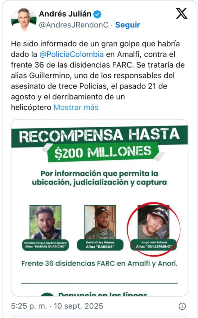 Por su cabeza, la Gobernación de Antioquia ofrecía una recompensa de hasta $200 millones.