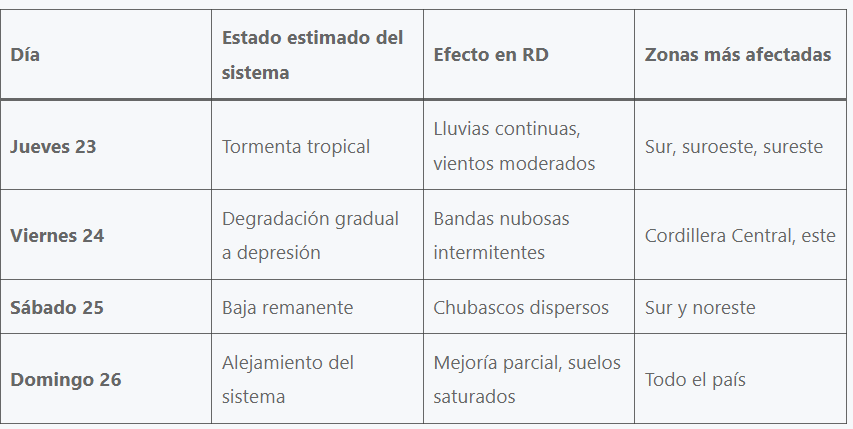 Según los modelos de predicción regional, Melissa comenzará a debilitarse gradualmente entre el viernes en la noche y el sábado, pero los efectos indirectos (lluvias, humedad y vientos) continuarán sintiéndose en el país hasta el domingo por la noche.