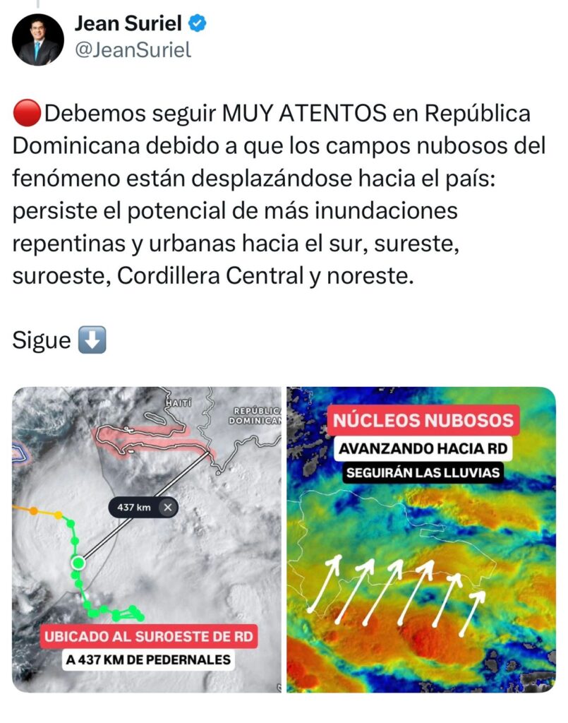 De acuerdo con Suriel, el fenómeno «sigue casi estacionario en aguas del Caribe central», lo que permite la entrada continua de campos nubosos hacia el sur, suroeste, sureste y Cordillera Central.