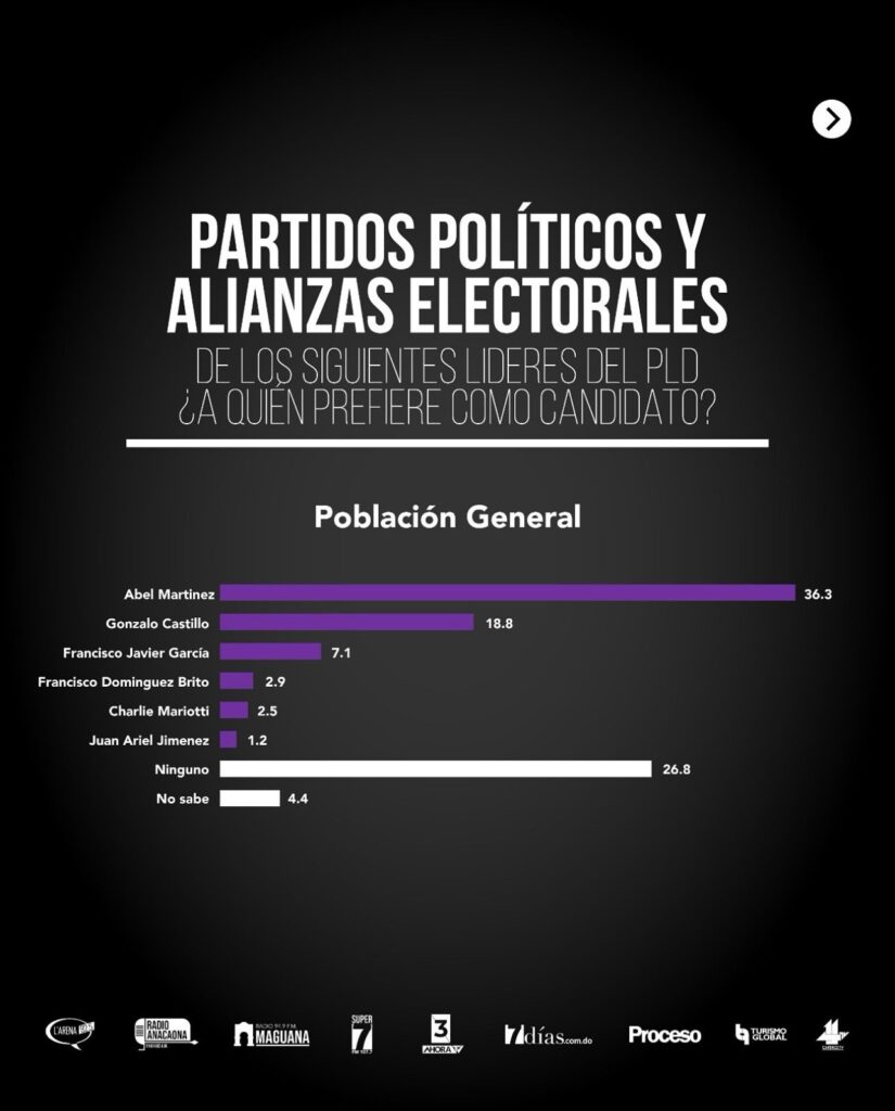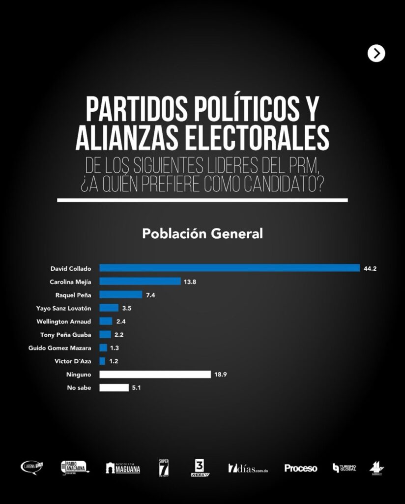 La encuesta también destaca que David Collado (PRM), Abel Martínez (PLD) y Omar Fernández (Fuerza del Pueblo) encabezan la lista de figuras con mayor proyección entre los posibles candidatos presidenciales.