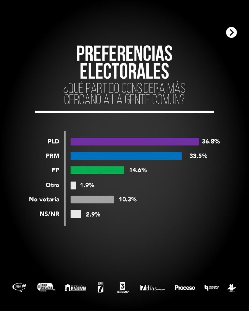 En cuanto a la percepción de cercanía al pueblo, el PLD supera al PRM al obtener un 36.8%, frente al 33.5% del partido oficialista. Estos resultados reflejan un panorama político dinámico, donde la conexión emocional con la ciudadanía se perfila como un factor decisivo de cara a los próximos comicios.
